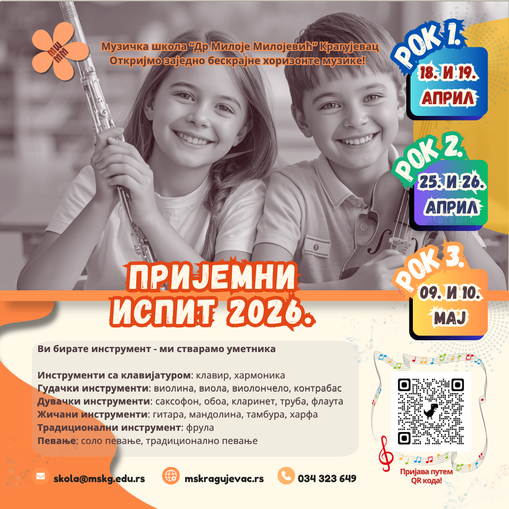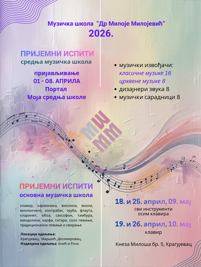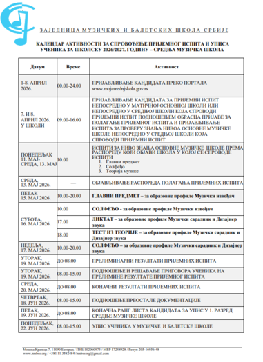 Објављен је Календар активности за спровођење пријемних испита и уписа ученика за 2026/27. - средња музичка школа.